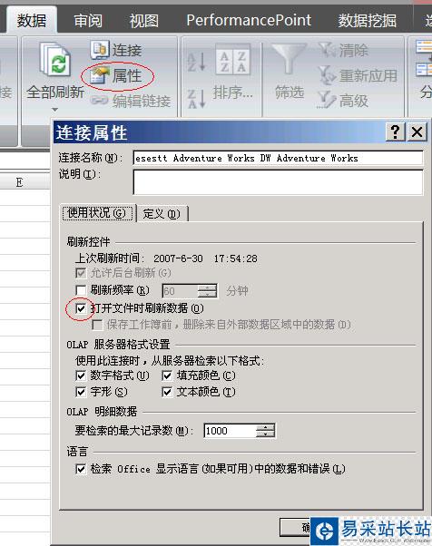 點擊數據連接屬性,在“使用狀況”中可以設定Excel中數據刷新頻率,以及是否從OLAP數據庫中讀取數據顏色、格式等屬性。