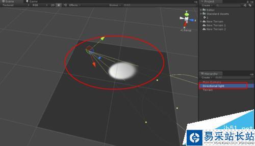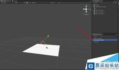 1、首先,啟動unity3d軟件。任意創建一個光源,為了體現光源的效果,本文還創建了一個地面。