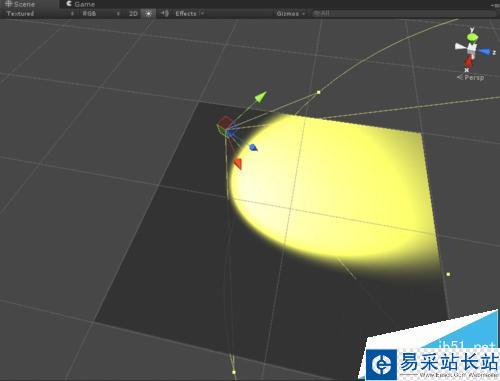 3、本文將光源換位聚光燈光源,可以看到名字卻還是平行光,可是情景窗口確實點光源的圖像。(為了讓聚光燈光源照到地面,本文將聚光燈光源的范圍設置為10000)