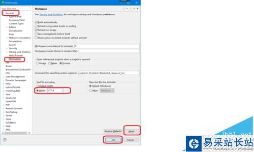 3、單擊“General”→“Workspace”,在“Text file encoding”中選擇“Other”→“UTF-8”,最后單擊“Apply”→“OK”即可。
