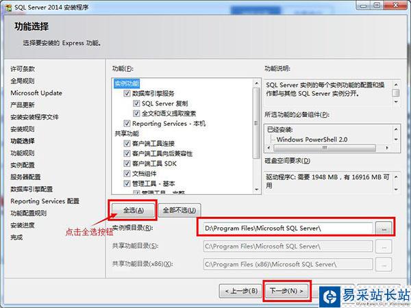 7、點擊全選按鈕,然后我們可以更換實例的根目錄,接著點擊下一步,如下圖所示。
