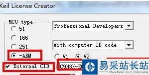 3、打開破解文件中的注冊機“Keil UV3 注冊機”,勾選-APM,然后勾選“external cid....”將復制的CID號復制到其中,最后點擊generate,將得到的id復制