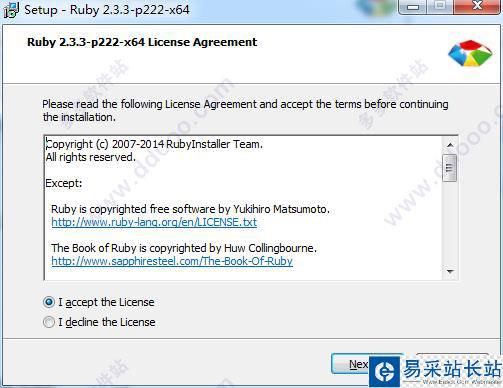 1.解壓壓縮包,如果你電腦為64位雙擊運行解壓后文件中的“rubyinstaller-2.3.3-x64.exe”,如果你是32位則運行"rubyinstaller-2.3.3.exe"。將出現以下安裝界面。