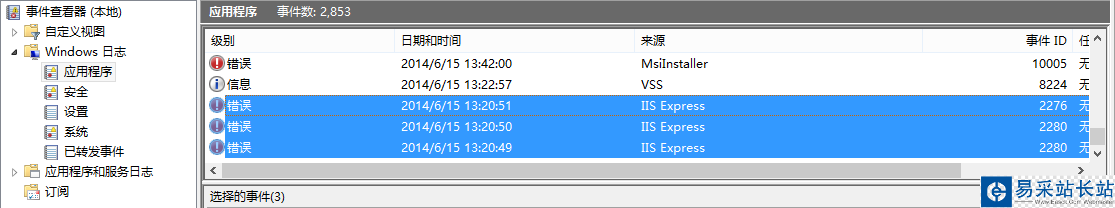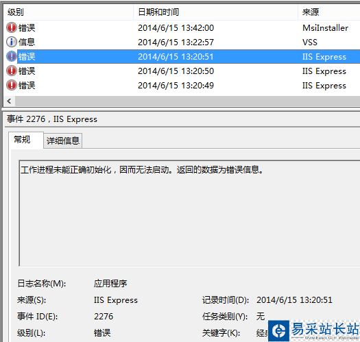 問題焦點已經很清楚了,就是IIS Express未能啟動。于是想到查看事件,看有沒有記錄更具體的日志。