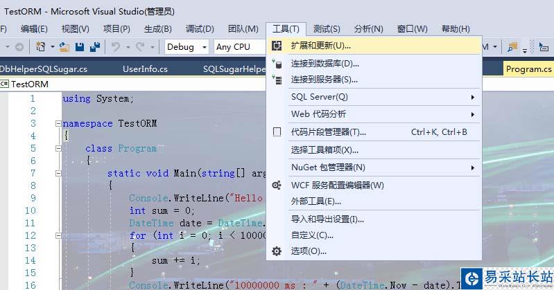 1、打開(kāi)VS2017,在“工具”里面打開(kāi)“擴(kuò)展和更新”