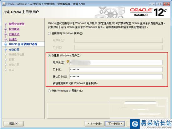7、這項功能是專門管理oracle文件的,選擇第二個”創建新windows用戶“,輸入用戶名和口令,單擊”下一步“
