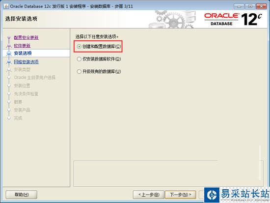 5、在“安裝選項”窗口中,選擇“創建和配置數據庫”,單擊“下一步”