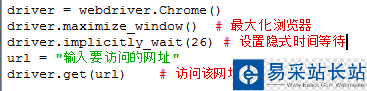 5、接著輸入一段下圖所示程序,該程序可以啟動并最大化瀏覽器,并訪問指定網(wǎng)址,注意其中隱性時間指的是,最大時間,即只要在該規(guī)定時間內(nèi),程序動作完成了,沒有達(dá)到最大時間,程序也會執(zhí)行下一步,但是如果超過最大時間,程序仍然沒有正常響應(yīng),程序會終止報錯。