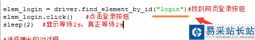 6、接著輸入下面代碼,通過id屬性,獲得并點擊某個按鈕,注意下圖箭頭所指部分,針對不同按鈕,需要自己定義,該段代碼可以獲得響應(yīng)id屬性的按鈕,并點擊,接著等待2秒鐘。注意用id屬性獲得按鈕,較有效。