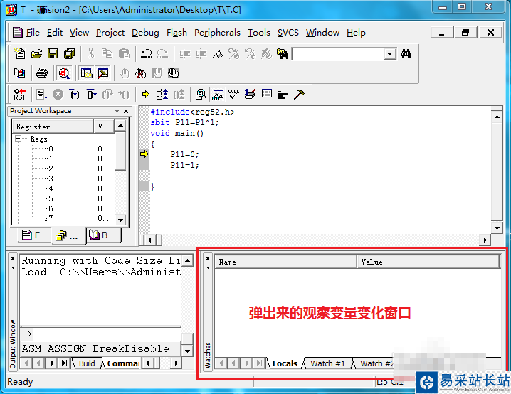 第四步:在彈出的”Watch“窗口中設(shè)置要要觀察的變量,點(diǎn)擊”Watch#1“→雙擊"type F2 to edit"→輸入要觀察的變量名,在這里我要觀察的是P11,具體操作如下:
