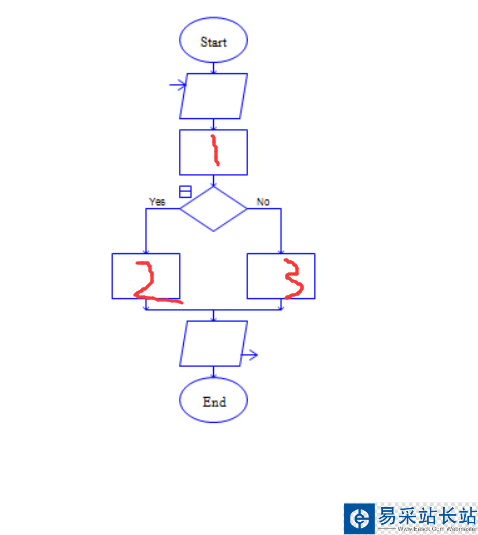 2、依次在Start和End間添加 輸入 賦值 選擇 賦值 賦值 輸出 符號 添加完后如圖所示