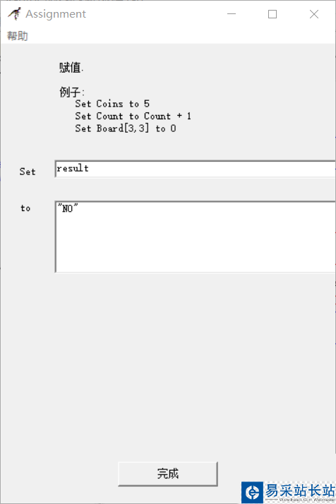 在賦值框1上方輸入 result 下方輸入 "YES"