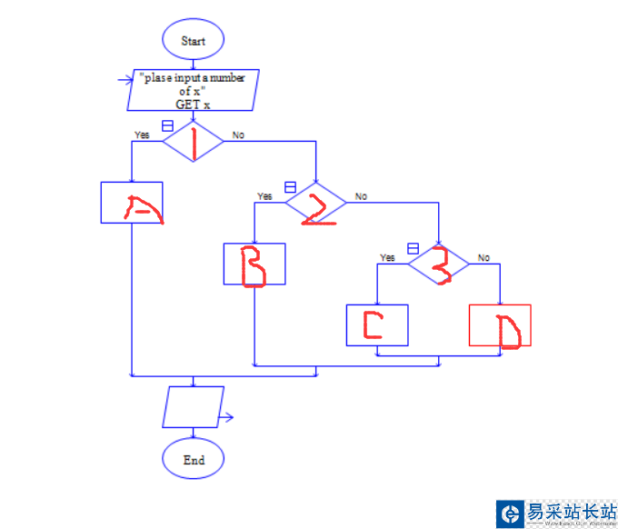 2、依次添加 輸入 選擇 賦值 選擇 賦值 選擇 賦值 賦值 符號到流程圖,添加完成后如圖所示。