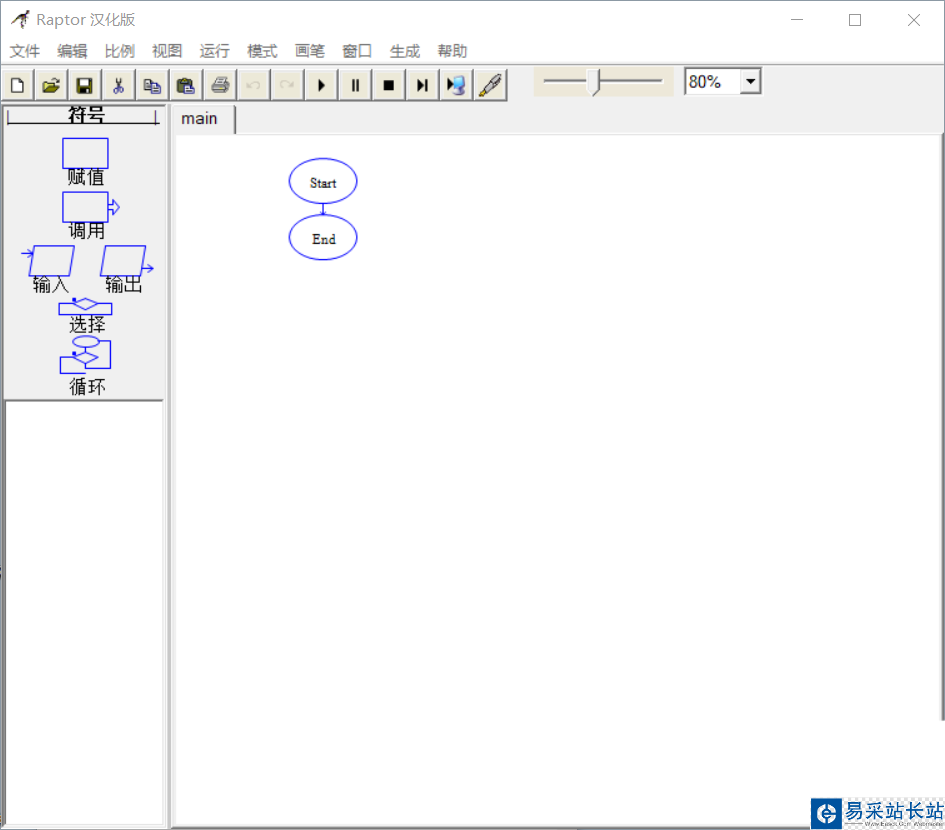 1、雙擊Raptor軟件,打開軟件。會彈出兩個窗口,一個是操作臺,寫程序用的。一個是主控臺 運行、監測程序用的。在左邊的是流程符號,可以單擊拖到流程圖中。