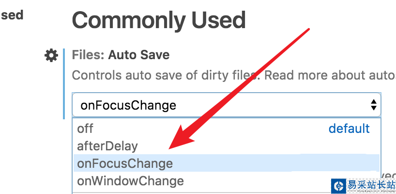 6、我們可以點擊下拉菜單選擇,里面有多個選項可以選擇。我們選擇選擇第三項,文件在編輯后,切換焦點,比如轉(zhuǎn)到編輯另一個文件后,就會觸發(fā)自動保存的。