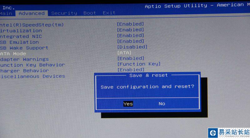 第三步驟:選擇好ATA模式后,按鍵盤上的F10鍵進行保存設置并自動退出重啟,當彈出窗口時,選擇“Yes”即可。如圖所示: