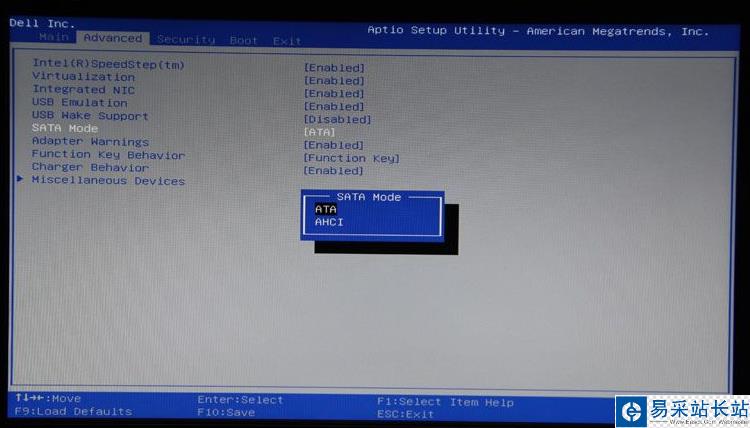 第二步驟:當按F2鍵進入bios后,找到并用鍵盤“←→”左右方向鍵移動到“Advanced-SATA Mode”,然后按Enter回車鍵,再按鍵盤的“↑↓”上下方向鍵選擇ATA。我們此次操作是將硬盤模式修改為