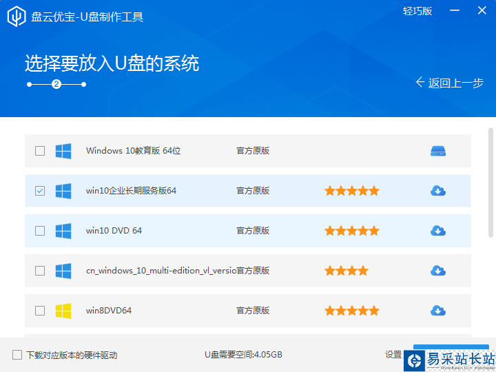 選擇要放入U盤的系統時,下方會有制作的U盤所需空間的提示,方便用戶對U盤可用空間做參考。