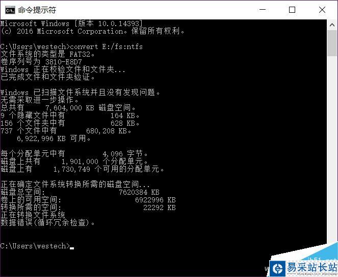修復完畢,重新在提示符下輸入轉換命令進行轉換,根據U盤空間大小以及存儲文件的多少,進行轉換時間也長短不一。