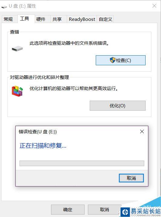 如果U盤存在錯誤,系統會出現提示,注意,這時候也僅僅將錯誤的文件鏈接修復,并不能真正修復U盤。這時候還要退回倒我的電腦,右鍵單擊磁盤選擇屬性,在工具項中選擇“檢查”執行修復工作。