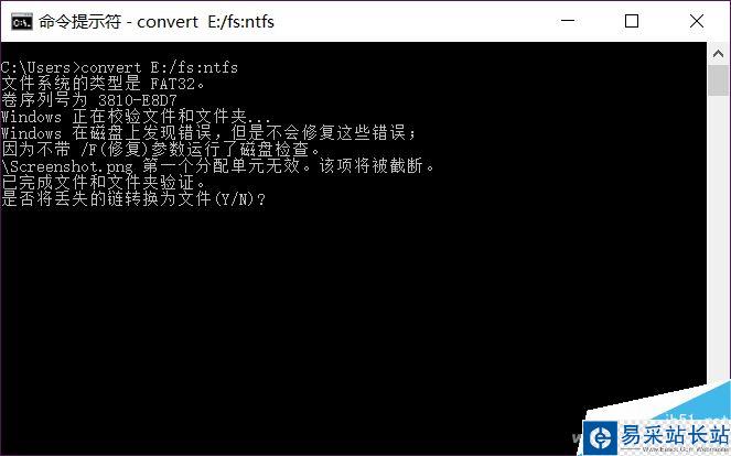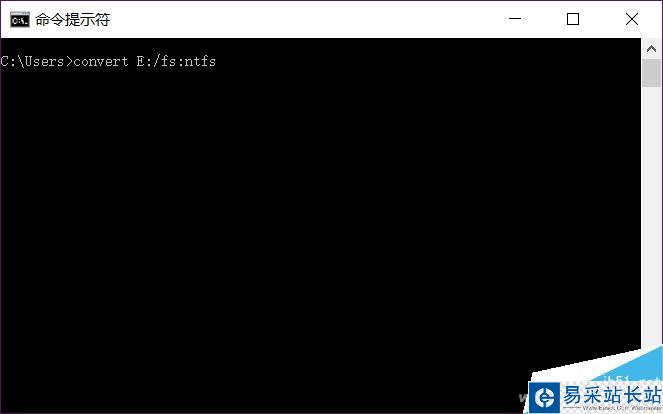 在命令行模式下輸入convert E:/fs:ntfs回車,注意中間空格,同時,E是小編電腦上的U盤盤符,要根據自己的盤符進行修改。