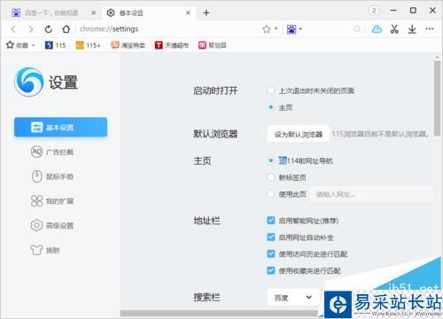 4、點擊“設置”命令選項后,這個時候會彈出瀏覽器“設置”對話框。如圖所示;