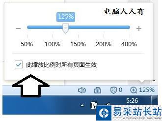 3、正常情況下,瀏覽器會保持100%顯示。如果眼力不好,可以將其選擇在125%左右,同時勾選下面的:此縮放比例對所有頁面生效。