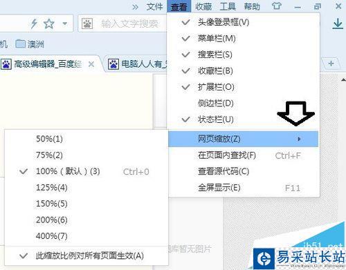 4、當然,點擊右上角的菜單欄→查看→網頁縮放→這里也有設置縮放比例的菜單。