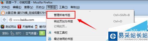 1、打開firefox瀏覽器,找到菜單欄(如果沒有菜單欄到空白處右鍵調出吧)如下圖,點擊“管理所有書簽”