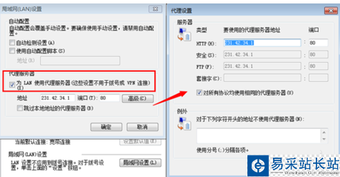 3、點(diǎn)擊進(jìn)入“局域網(wǎng)設(shè)置”之后, 找到“代理服務(wù)器”勾選“為L(zhǎng)AN使用代理服務(wù)器(這些設(shè)置不用于撥號(hào)和VPN連接” 網(wǎng)上找到一些免費(fèi)的代理服務(wù)器IP和端口添加進(jìn)入即可。