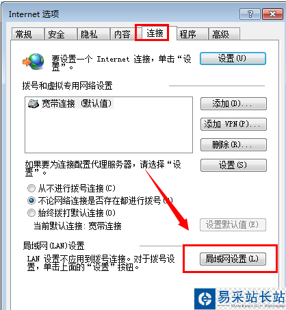 2、打開internet選項(xiàng)功能菜單之后,找到“連接----局域網(wǎng)設(shè)置”如箭頭所示的位置,進(jìn)入設(shè)置LAN代理功能菜單
