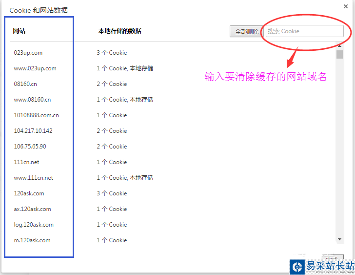 5、這時打開的界面會顯示出所有存在緩存數據的網站域名信息(左邊藍框),右上角有一個搜索功能,輸入您在操作的存在緩存的網站域名,查找到對應域名