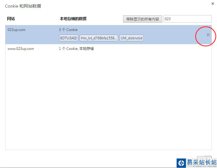 6、點擊要清除的此條域名信息,會出現藍色背景被選中狀態,并且右面有一個“X”號,點擊“X”號,再點擊右下角-》完成,就可以啦。