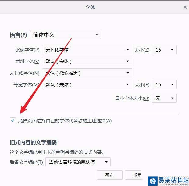 5、在打開的字體高級設置窗口中,找到“允許頁面選擇自己的字體代替您的上述選擇”設置項。
