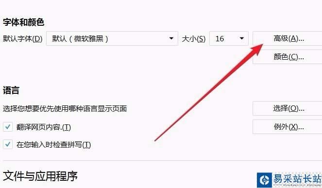 4、然后在右側的窗口中找到“字體和顏色”設置項,點擊其后面的“高級”按鈕。