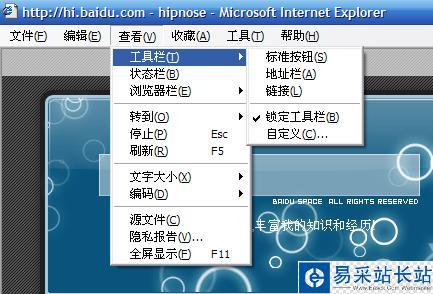 3.接著點擊查看>工具欄,如下圖將“標(biāo)準(zhǔn)按鈕”、“地址欄”、“鏈接”前面的勾都去掉