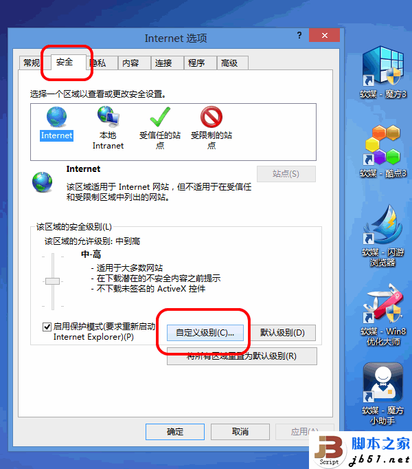 1、打開IE中的Internet選項(閃游瀏覽器中請直接按下F7)打開IE中的Internet選項,切換到“安全”標簽,然后點下自定義按鈕,如下圖所示——