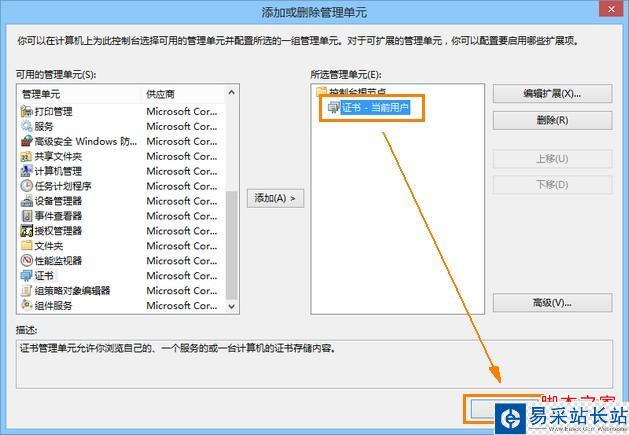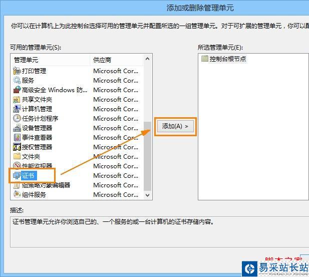 3、在彈出的窗口左側(cè)列表中選中“證書”在點(diǎn)擊“添加”;