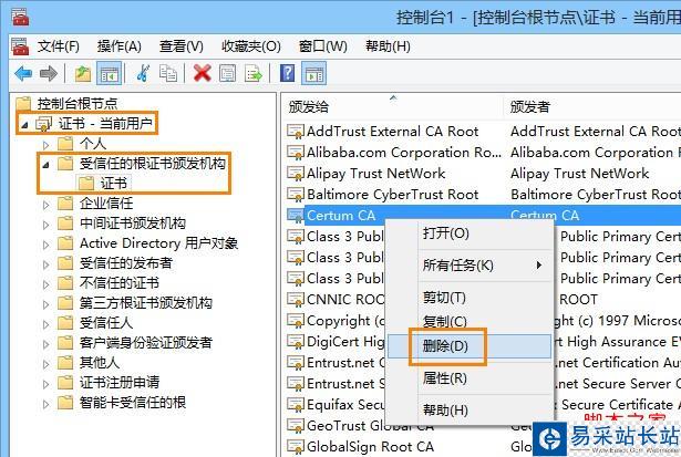 6、展開(kāi)“證書”=》“受信任的根證書頒發(fā)機(jī)構(gòu)”=》“證書” ,在右側(cè)列表中查找你需要?jiǎng)h除的證書,然后在將其刪除;