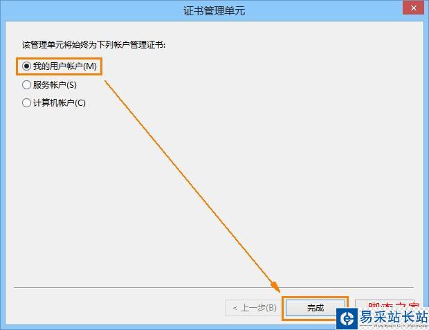 4、在證書管理單元的賬戶中選擇“我的用戶賬戶”,點(diǎn)擊“完成”;