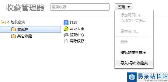 3.這個時候收藏夾管理器打開了,在"整理"按鈕中選擇:導(dǎo)出、導(dǎo)入收藏夾