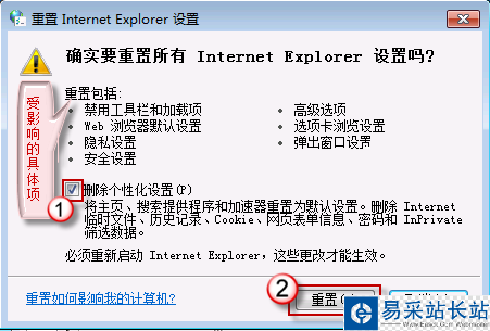 請勾選“刪除個性化設置”,然后按一下“重設”。