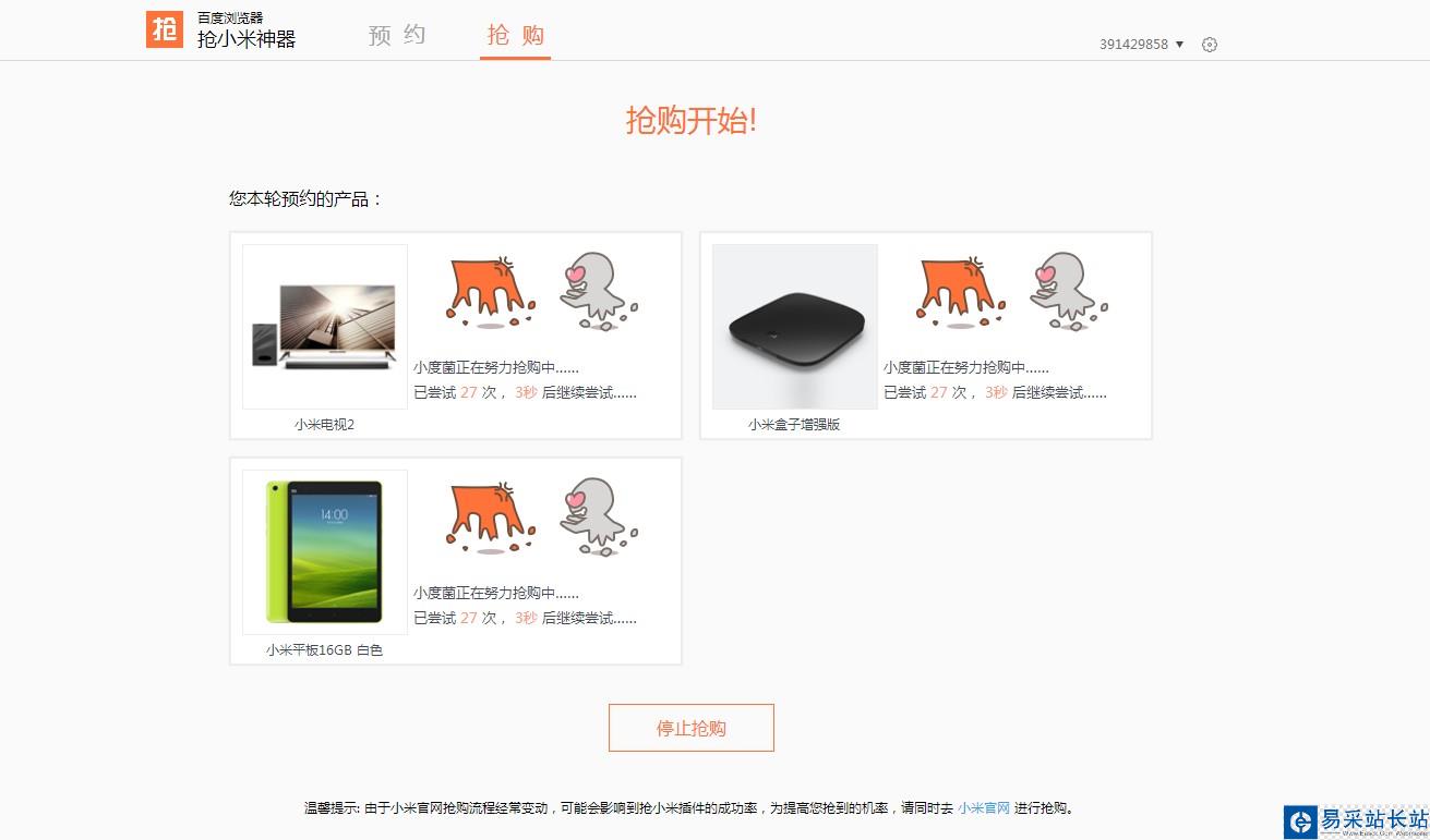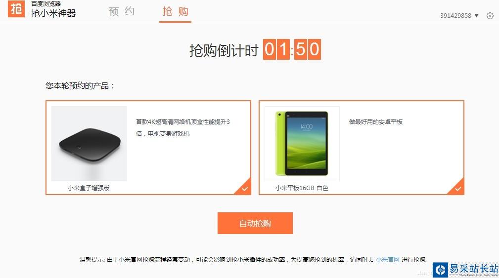 插件會在官方搶購開始前半個小時11:30開啟自動搶購,米粉們可以提前選定好需要搶購的商品,點擊“自動搶購”按鈕,即可放心把任務交給我們的搶小米插件,等待12點到來,由我們的搶小米神器為您自動搶購。