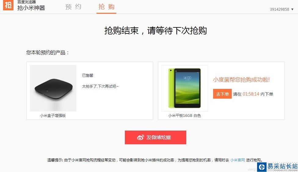 建議米粉們在周二10點半前提前登錄搶小米插件,可以錯過小米服務器登錄高峰,保證登錄后可以立即查看自己的預約產(chǎn)品信息。