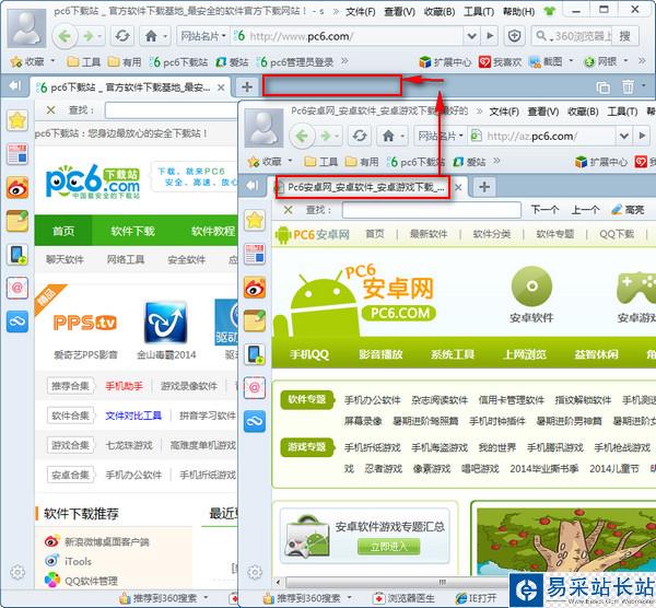 鼠標(biāo)左鍵拖動(dòng)那個(gè)網(wǎng)頁標(biāo)簽(注意是標(biāo)簽不是窗口)