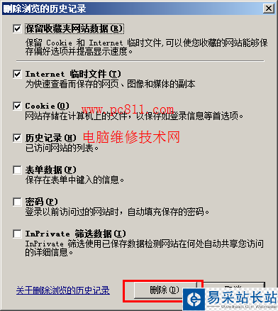 第2步:彈出“刪除瀏覽的歷史記錄”對話框,在該對話框中,用戶可以根據(jù)需要選中相應(yīng)選項(xiàng),本文這里是選擇 【刪除】按扭。