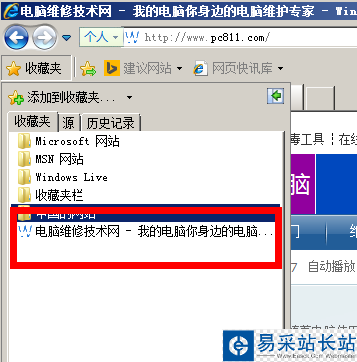 第1步:在“IE瀏覽器”窗口,單擊“收藏夾”按鈕,然后在左側的任務窗格中單擊“添加到收藏夾”右側的下三角按鈕,從彈出的列表框中選擇“添加到收藏夾欄”選項。