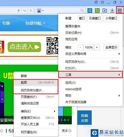 另外,大家還可以在百度瀏覽器菜單中的,工具中找到“截圖”功能,如下圖所示: