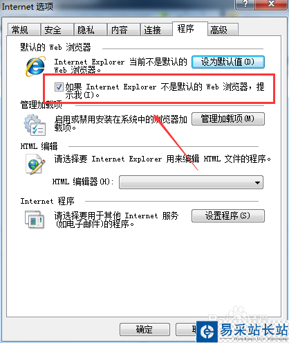 4、在程序選項卡里可以看到“如果Internet Explorer不是默認的Web瀏覽器,提示我”被勾選中,如下圖所示。