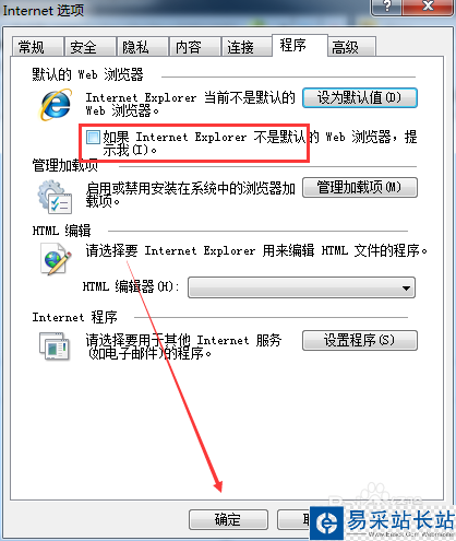 5、將“如果Internet Explorer不是默認的Web瀏覽器,提示我”前面的勾子去掉,然后點擊確定,如下圖所示。